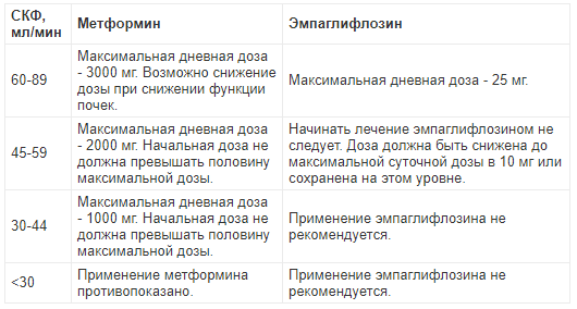 Согласно механизму действия, эффективность эмпаглифлозина зависит от функции почек. Рекомендуется перед началом терапии и регулярно в последующем определять СКФ.