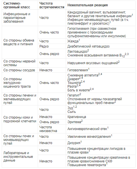 В клинических исследованиях наиболее часто сообщавшимся нежелательным явлением была гипогликемия, которая зависела от типа фоновой терапии, использовавшейся в соответствующих исследованиях, инфекции мочевыводящих и половых путей, увеличение мочеотделения.