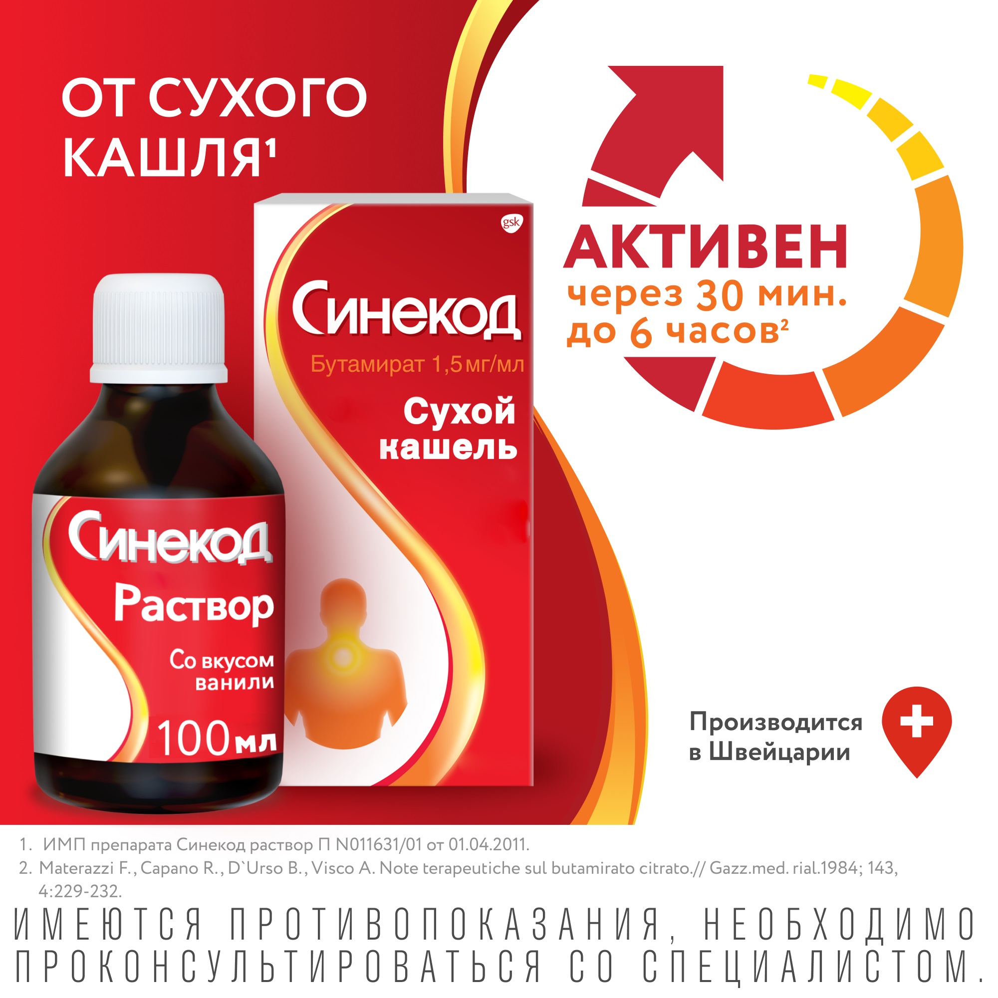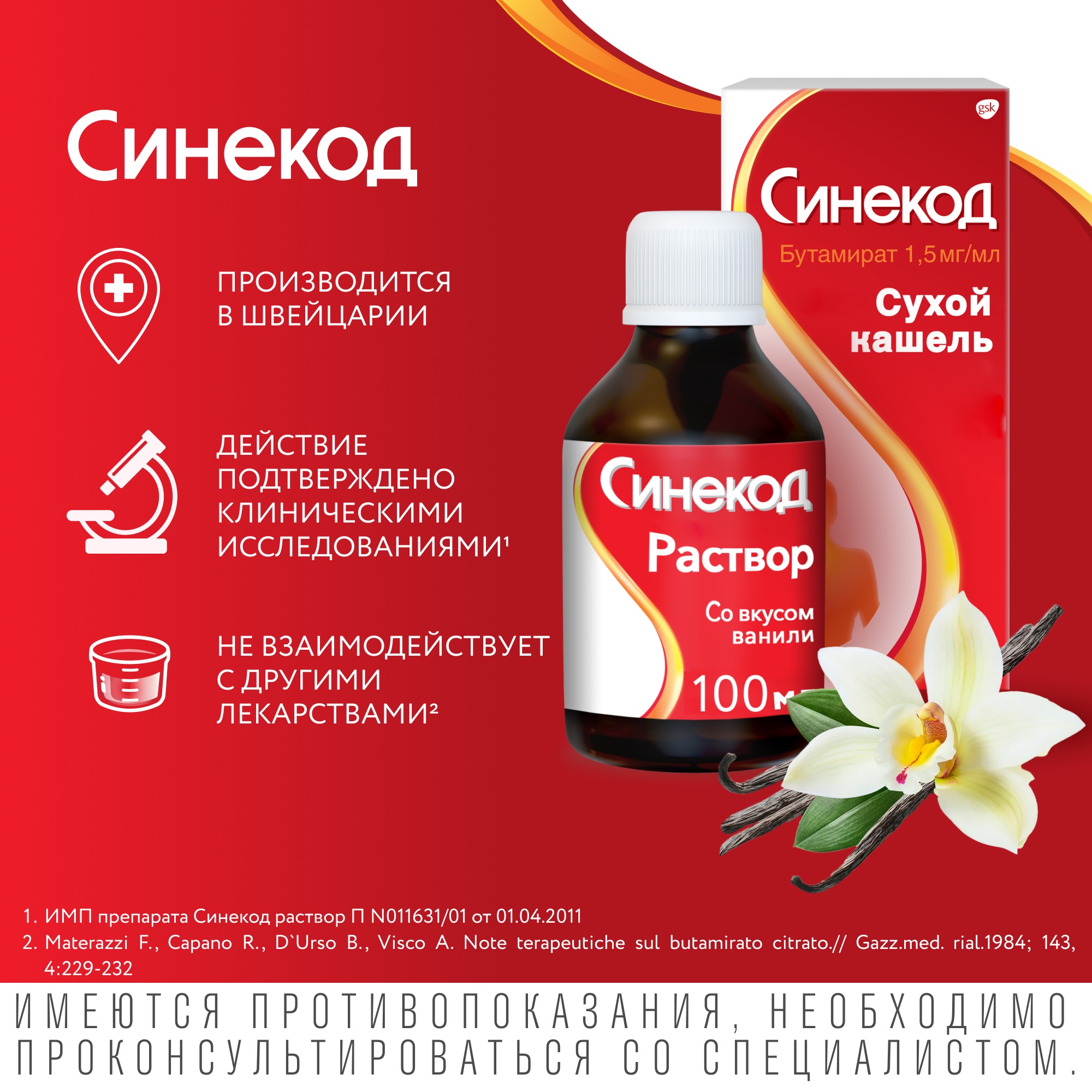 Бутамират, активное вещество препарата Синекод®, является противокашлевым средством центрального действия, не относится к алкалоидам опия ни химически, ни фармакологически. Не формирует зависимости или привыкания.