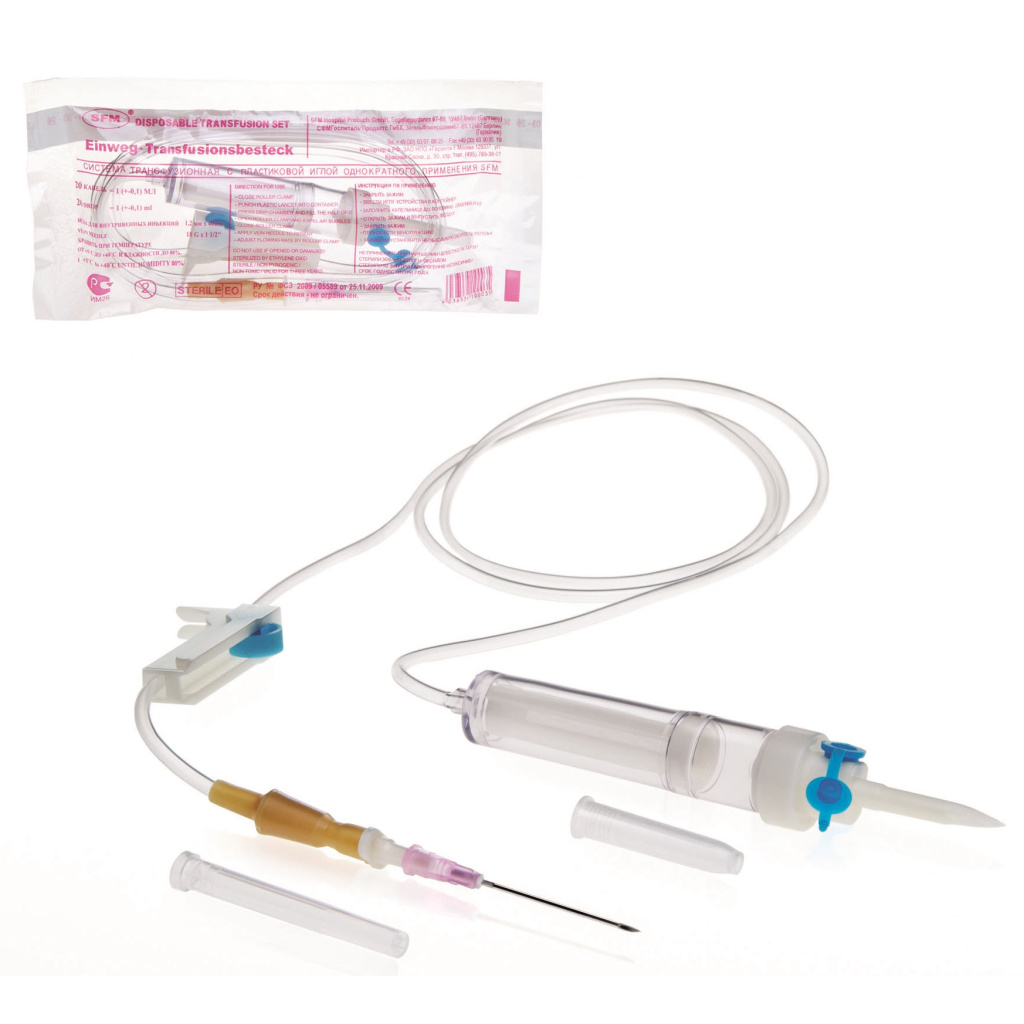 Одноразовая трансфузионная система SFM переливания крови оборудована пластиковым шипом с интегрированным воздушным клапаном и фильтром. Также в комплектацию входят:гибкий шланг длиной 150 см с роликовым регулятором скорости потока и безлатексной вставкой для впрыска во время инфузии, прозрачная капельная камера с фильтром для крови и кровозаменителей, игла со специальной тройной заточкой и силиконовой обработкой. Система стерилизована оксидом этилена, апирогенна и поставляется в герметичной упаковке, которая легко открываются.