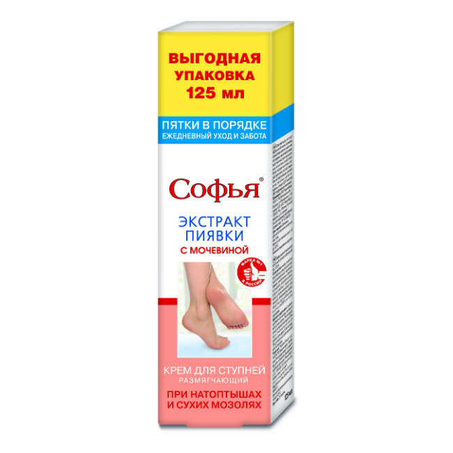 Софья крем с экстрактом пиявки и мочевиной, для ступней при натоптышах и сухих мозолях. Эффективное средство на основе натуральных компонентов для устранения натоптышей и сухих мозолей. Смягчает, увлажняет и разрыхляет загрубевшую кожу ступней, сухие мозоли и натоптыши, облегчает удаление утолщенного рогового слоя кожи и сухих мозолей, предотвращает их появление.