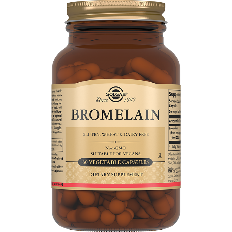 Бромелайн – это пищеварительный фермент, выделенный из ананаса. «Бромелайн 500 мг» способствует пищеварению, расщеплению белковой пищи и усвоению ее организмом, а также рекомендуется в качестве дополнительной терапии для уменьшения воспаления, отека и ускорения восстановления тканей при спортивных травмах, ушибах, растяжениях.