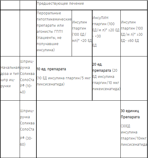 Начальная доза препарата Соликва СолоСтар® выбирается, исходя из предшествующего лечения гипогликемическими препаратами, и не должна превышать начальную дозу ликсисенатида 10 мкг.