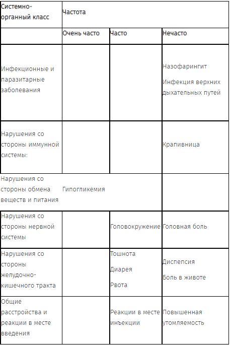 * Документированная, протекающая с клинической симптоматикой гипогликемия была эпизодом, во время которого типичные симптомы гипогликемии сочетались с установленной плазменной концентрацией глюкозы в крови ≤ 70 мг/дл (3,9 ммоль/л).
