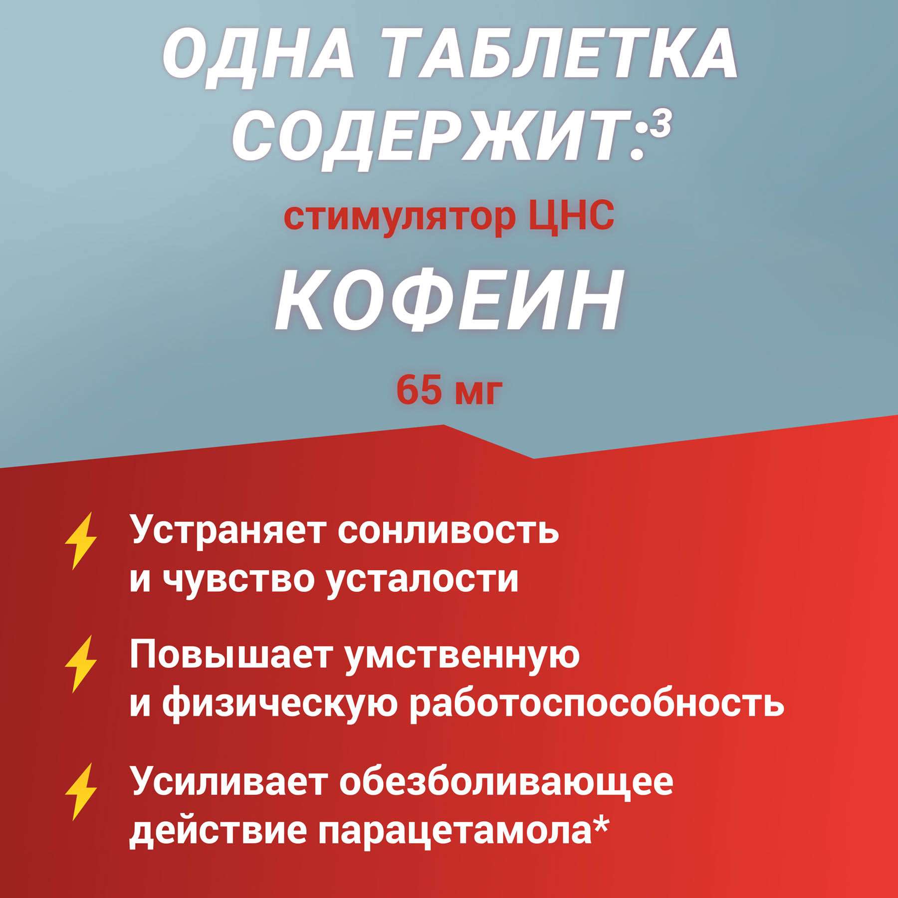 Действующие вещества: парацетамол - 500 мг, кофеин - 65 мг.