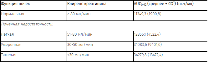 У пациентов с почечной недостаточностью средней степени тяжести (клиренс креатинина 30-50 мл/мин) рекомендованная доза не должна превышать 200 мг два раза в день.