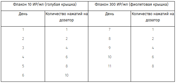 1. Начальную терапию начинают с ежедневного приема препарата концентрации 10 ИР/мл (голубая крышка флакона) с одного нажатия на дозатор и постепенно увеличивают ежедневную дозировку до 10 нажатий. Одно нажатие на дозатор составляет около 0,1 мл препарата.