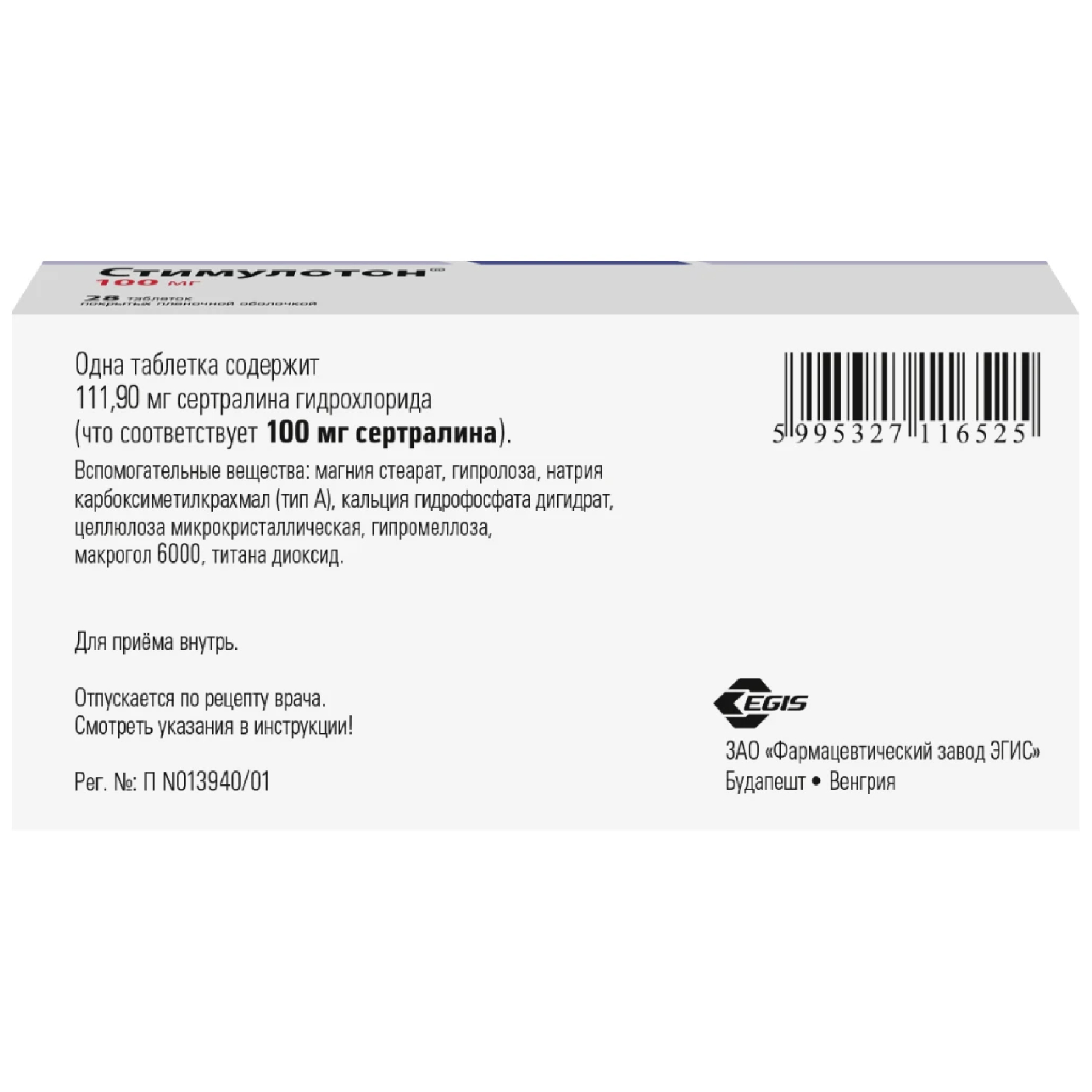 Активное вещество: сертралина гидрохлорид 111.9 мг, что соответствует содержанию сертралина 100 мг.