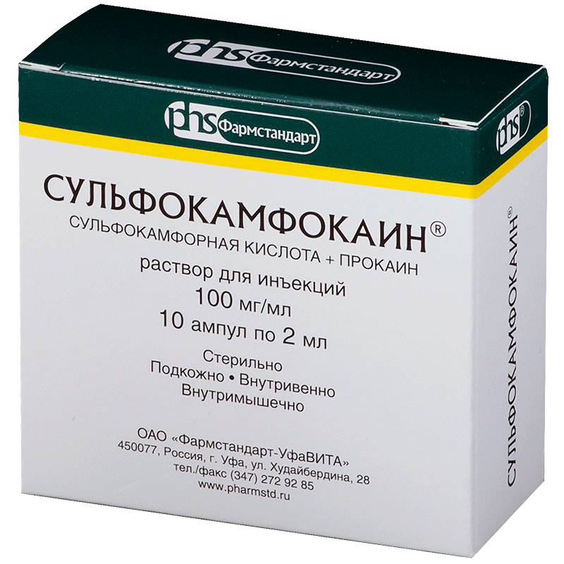 Активные вещества: прокаин 50.4 мг, сульфокамфорная кислота (в пересчете на безводную) 49.6 мг.