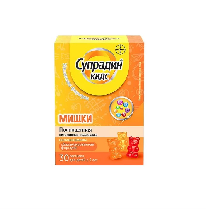 Супрадин Кидс Мишки сбалансированный мультивитаминный комплекс с усиленным содержанием необходимых ребенку витаминов: А, В3, В7 (биотин), С, D3, E.