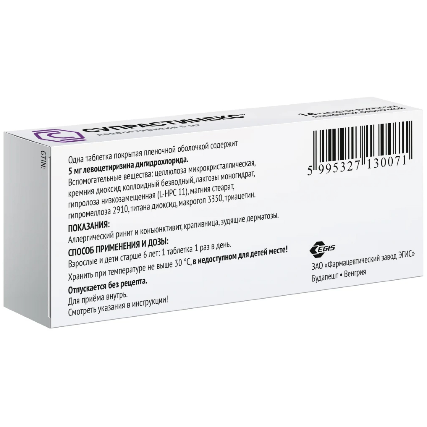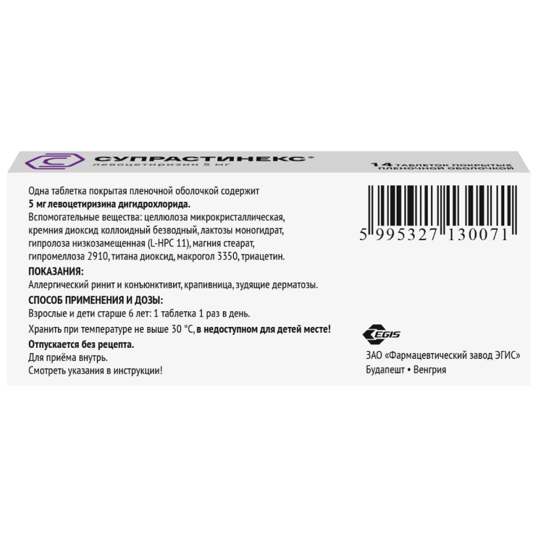 Активное вещество: левоцетиризин - 5 мг.