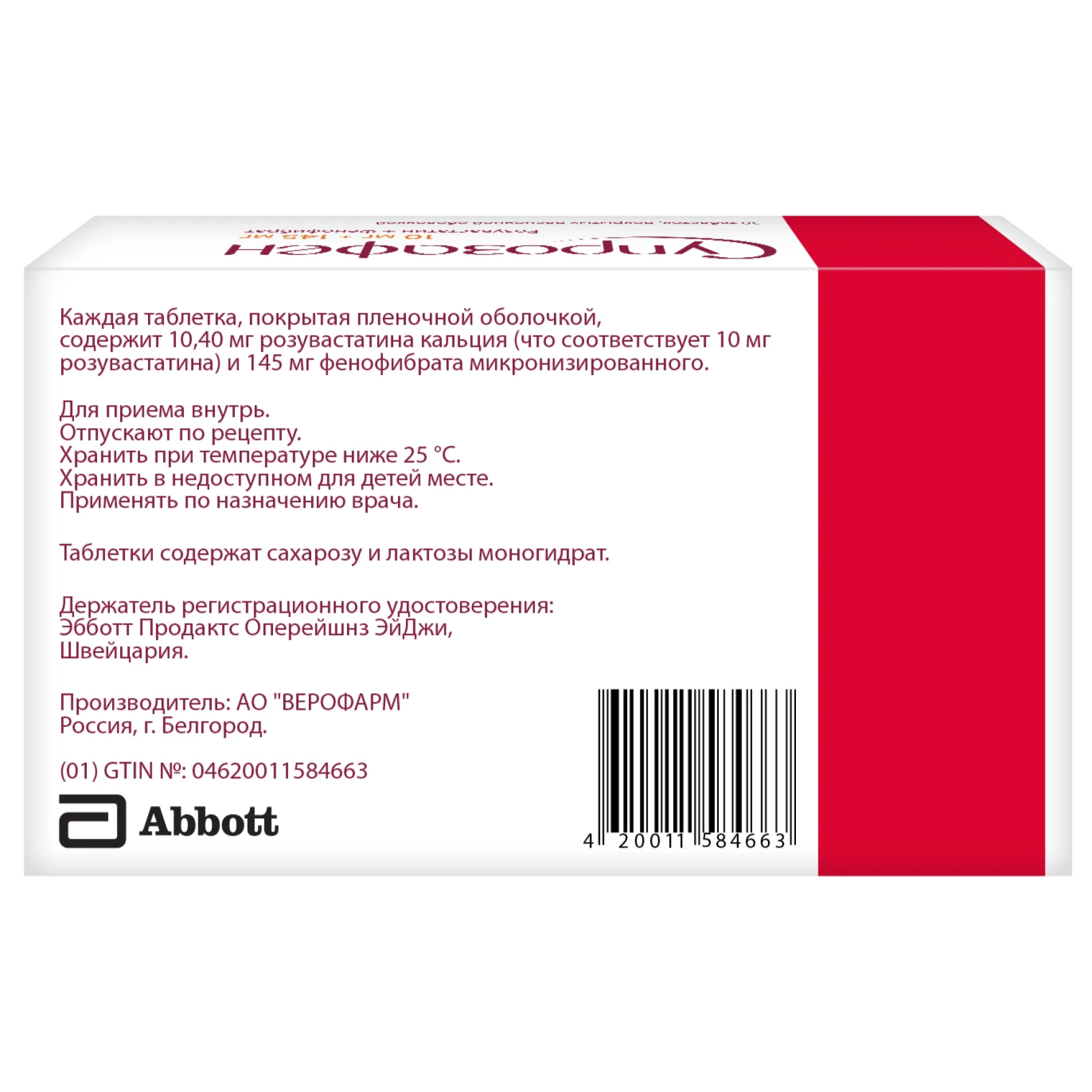 Действующими веществами являются розувастатин кальция и фенофибрат. Каждая таблетка содержит 10,20 мг розувастатина кальция (что соответствует 10,00 мг розувастатина) и 145 мг фенофибрата микронизированного.