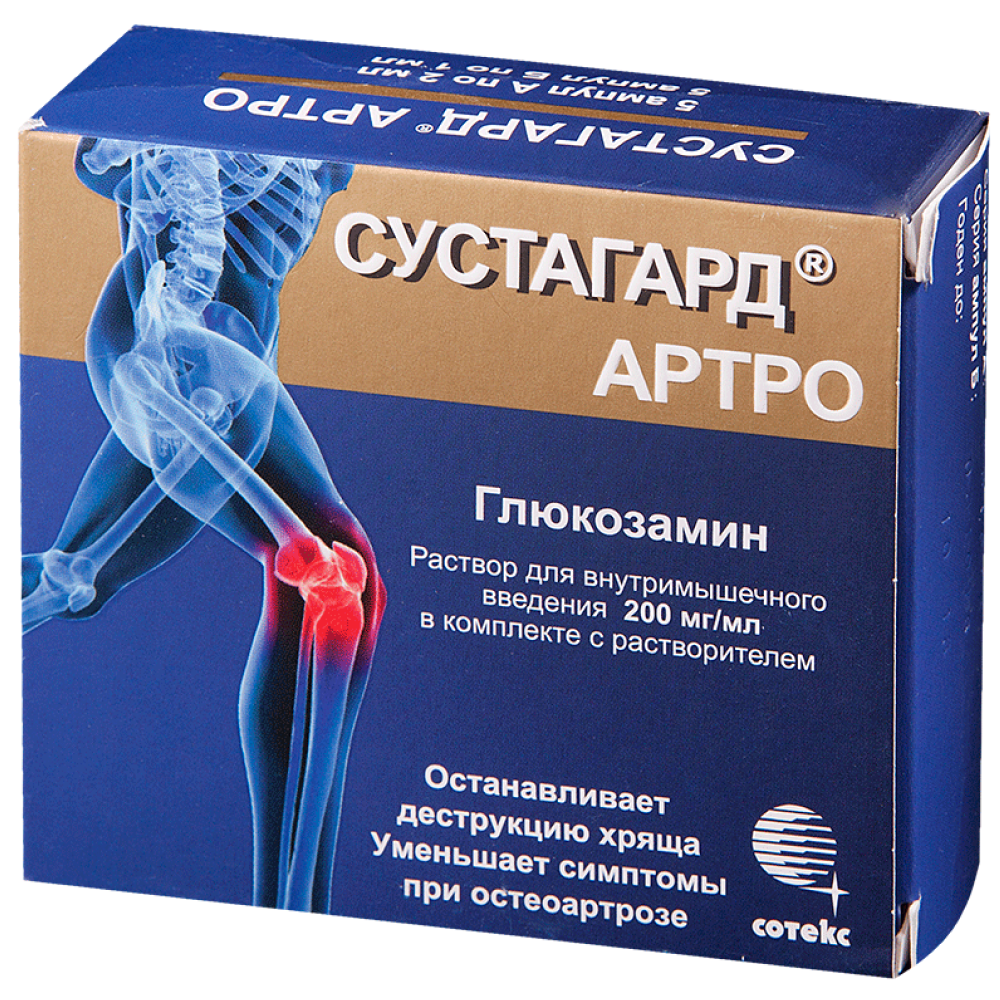 Глюкозамина сульфат, активный компонент препарата Сустагард® Артро, представляет собой соль натурального аминомоносахаридного глюкозамина, который физиологически содержится в организме. Глюкозамин стимулирует синтез хондроцитами протеогликанов (гликозаминогликанов и гиалуроновой кислоты) синовиальной жидкости; ингибирует ферменты (в т.ч. коллагеназу, фосфолипазу А2), вызывающие деструкцию хрящевой ткани; препятствует образованию супероксидных радикалов, подавляет активность лизосомальных ферментов; инициирует процесс фиксации серы в синтезе хондроитинсерной кислоты и способствует нормальному отложению кальция в костной ткани; препятствует повреждающему действию кортикостероидов на хондроциты и нарушению синтеза гликозаминогликанов, индуцированному НПВП.