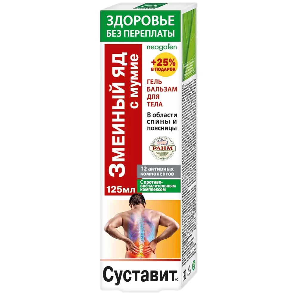 Гель-бальзам для тела "Суставит. Змеиный яд. Мумие - эффективное средство на основе природных компонентов. Способствует нормализации функцио-ального состояния. Обеспечивает структурными элементами для активного обновления и гибкости. Стимулирует естественную регенерацию тканей, препятствует развитию деструктивных процессов и старению. Действие и эффективность геля-бальзама обеспечены высокой биологической активностью его натуральных компонентов, обладающих выраженным положительным комплексным действием.