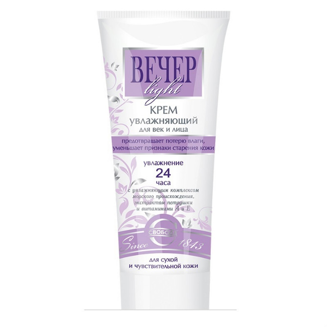 Крем Вечер light увлажняющий для век и лица предназначен для профилактики морщин и уменьшения признаков старения, рекомендован для сухой и чувствительной кожи.