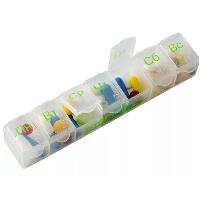 Таблетница на семь дней состоит из 7-ми отделений, которые соответствуют дням недели. Для людей с ослабленным зрением нанесены символы Брайля.