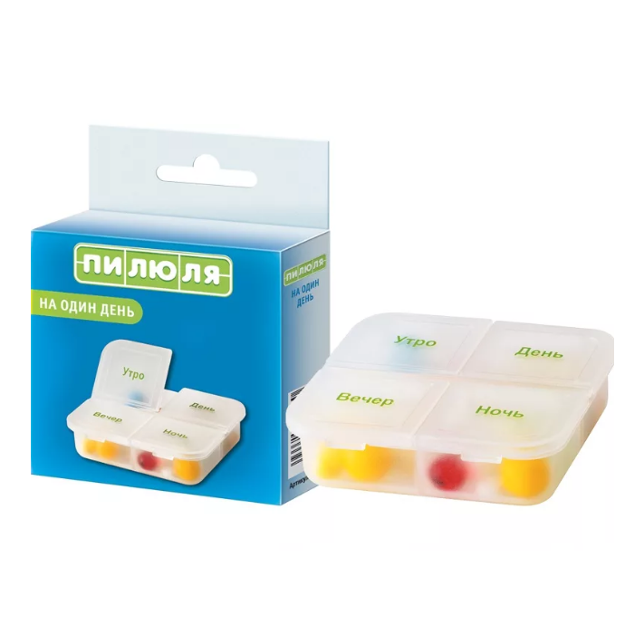 Таблетница на один день состоит из 4-х отделений для распределения лекарств или витаминов в соответствии с суточным режимом приема: утро, день, вечер, ночь. Для людей с ослабленным зрением содержит символы Брайля.