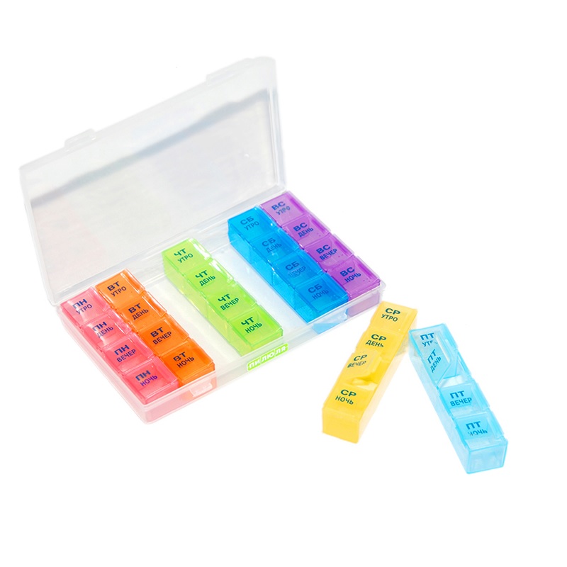 Таблетница разделена на секции, в каждую из которых вы можете поместить нужный набор препаратов: распределите их по дням (на всю неделю) и по времени приема (утро, день, вечер).