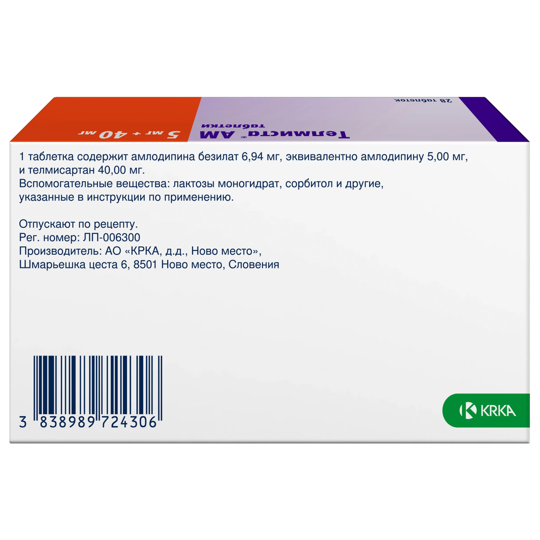 пациентам, у которых применение только амлодипина или только телмисартана не приводит к адекватному контролю АД. Пациенты, принимающие амлодипин в дозе 10 мг, у которых отмечаются HP, ограничивающие прием препарата, например, периферичесие отеки, могут быть переведены на препарат Телмиста® AM в дозе 5 мг + 40 мг 1 раз в сутки, что позволит уменьшить дозу амлодипина, но не снизит общее ожидаемое антигипертензивное действие.