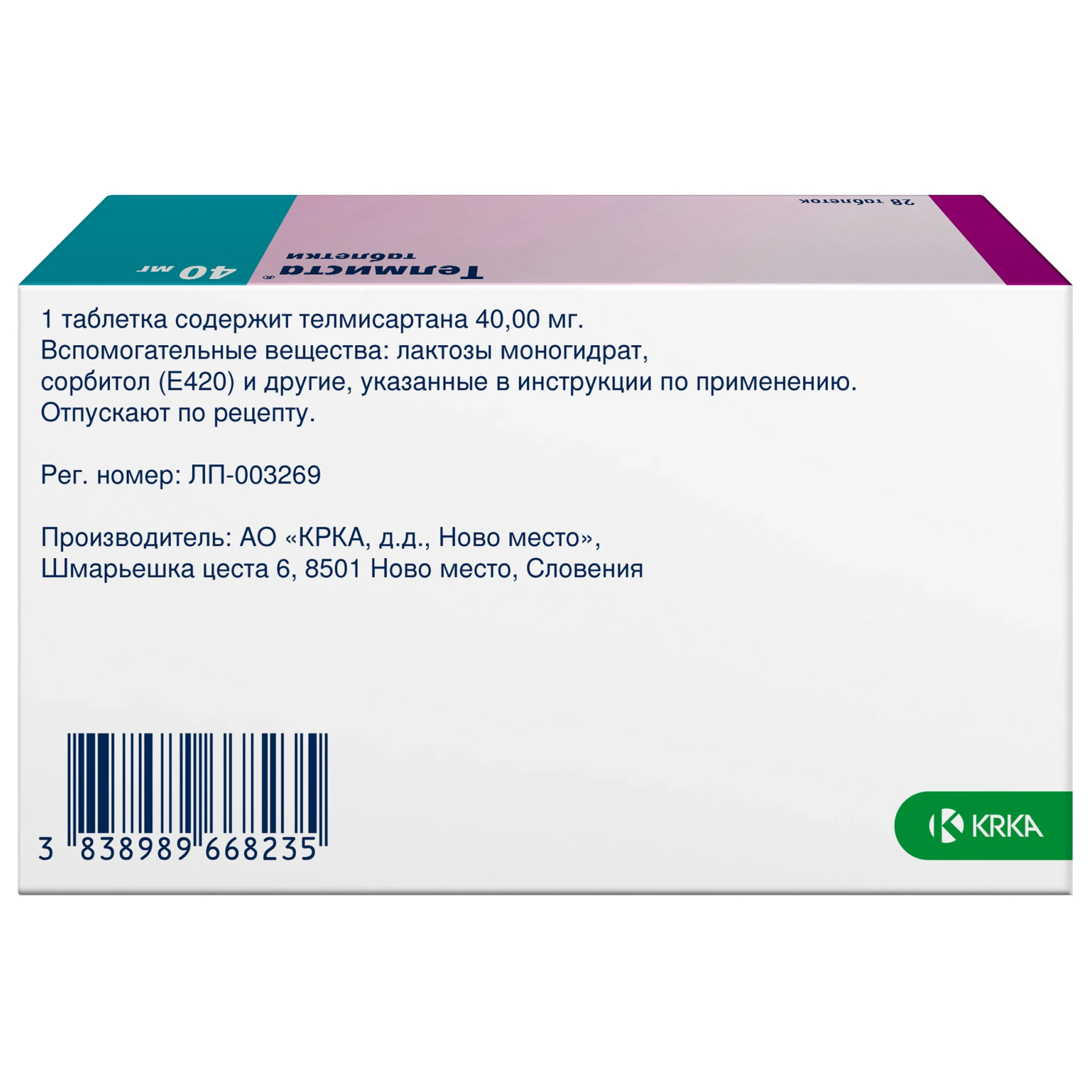 Активное вещество: телмисартан - 40 мг.