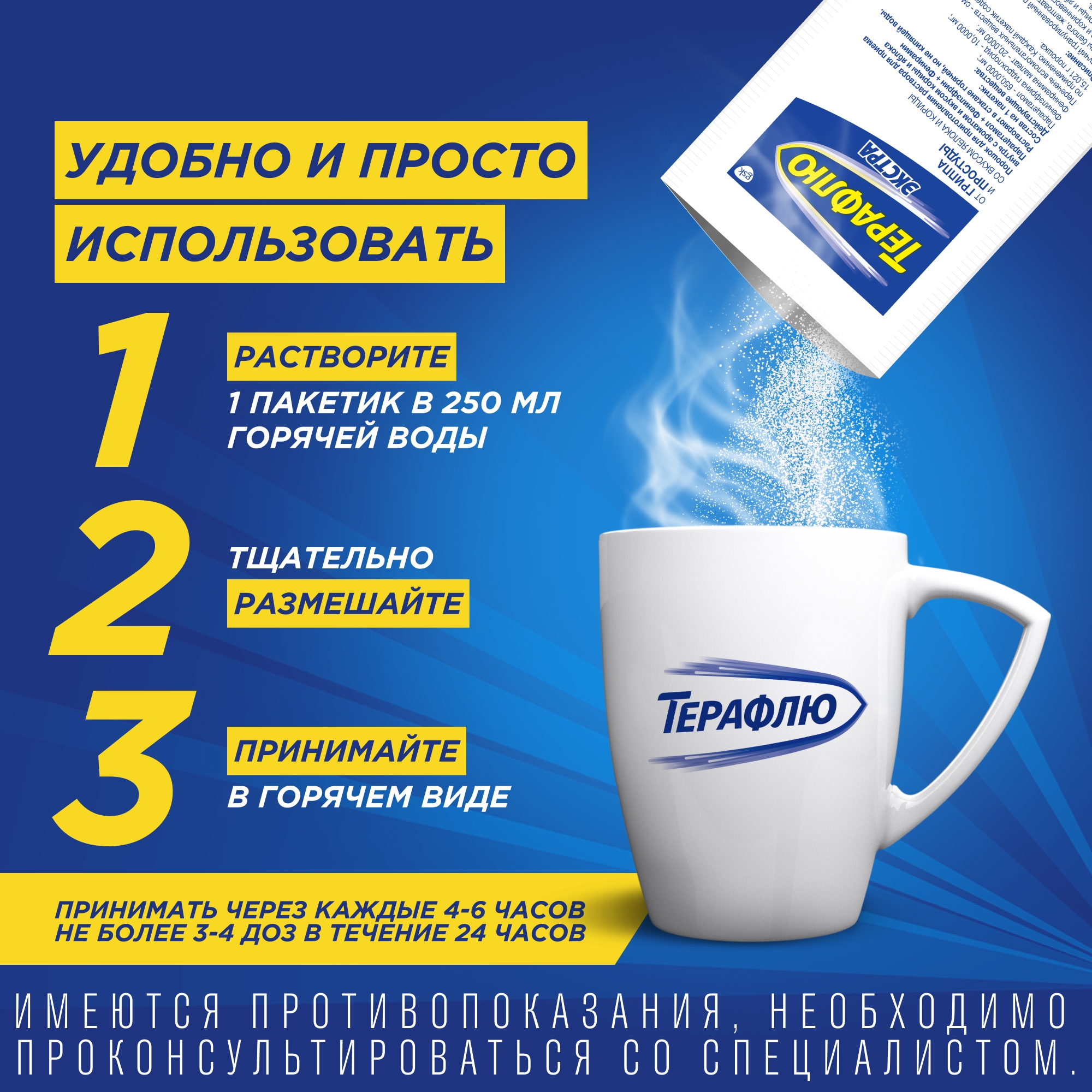 ТераФлю® от гриппа и простуды Экстра можно применять в любое время суток, но наилучший эффект приносит прием препарата перед сном, на ночь.