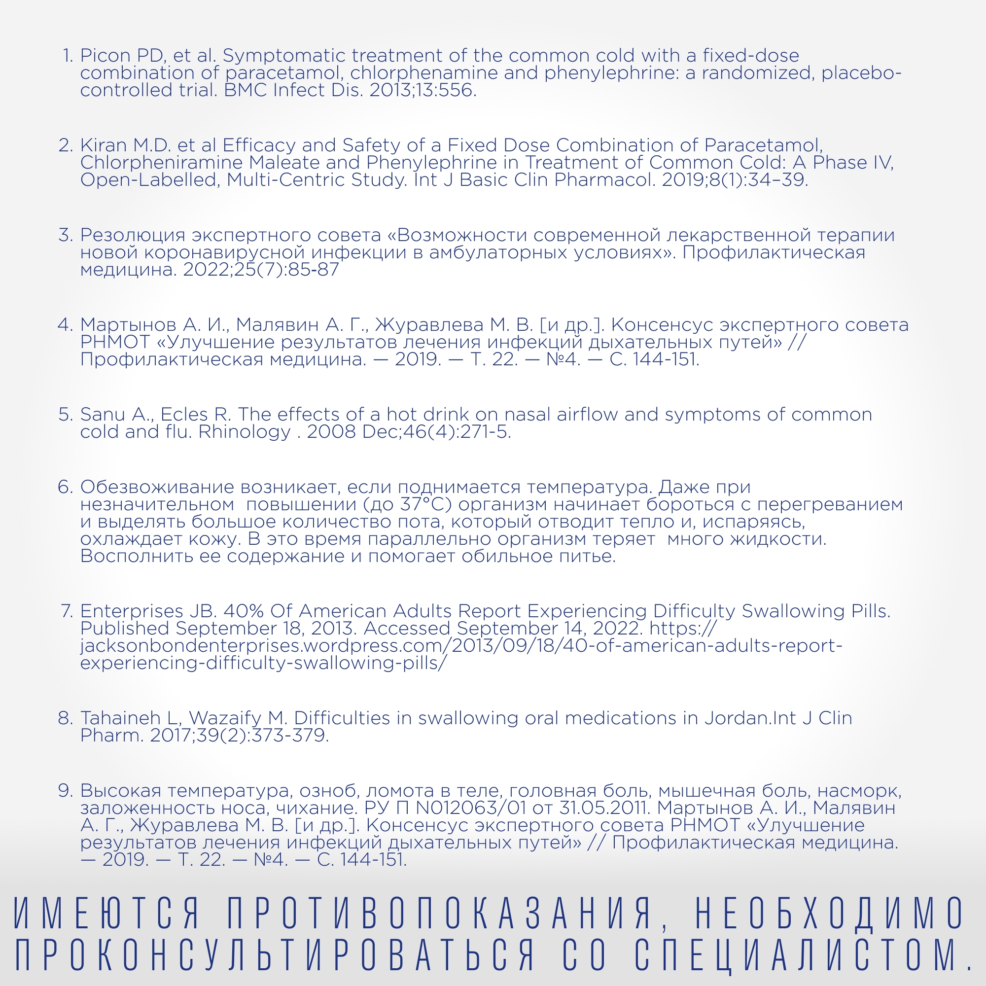 Во избежание токсического поражения печени прием препарата не следует сочетать с применением алкогольных напитков. Содержит парацетамол, не применять с любыми другими препаратами, содержащими парацетамол.