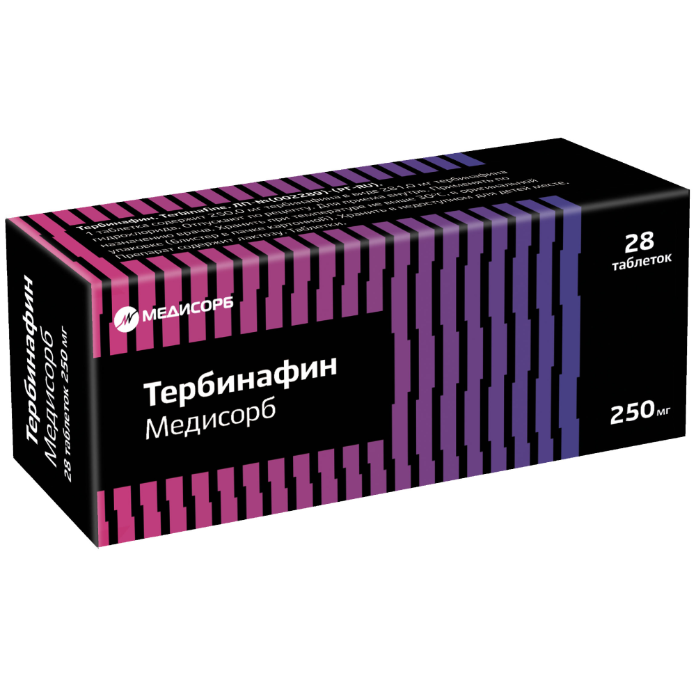 Активное вещество: тербинафина гидрохлорид 281.5 мг, что соответствует содержанию тербинафина 250 мг.