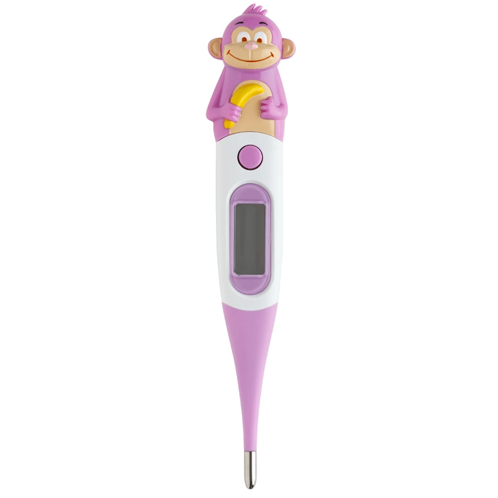 Данная модель особенно актуальна при измерении температуры маленьким детям. Корпус термометра имеет гибкий наконечник и яркую расцветку, а крышка батарейного отсека выполнена в форме забавного животного, что поможет отвлечь и заинтересовать ребенка и сделать процедуру измерения температуры увлекательной.