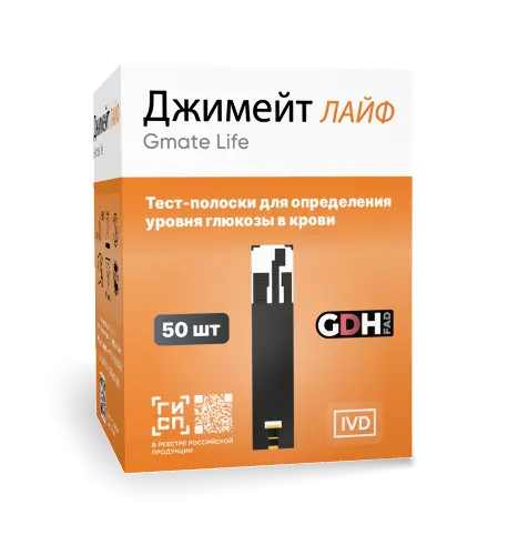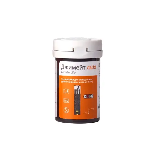 Тест-полоски Gmate Life / Джимейт Лайф для определения уровня глюкозы в крови предназначенные для диагностики in vitro с целью электрохимического определения содержания глюкозы в свежей капиллярной и венозной крови в комплекте с глюкометром Gmate Life. Тест-полоски предназначены для использования в комплекте с глюкометром пациентами в домашних условиях и работниками здравоохранения (высшим и средним медицинским персоналом) в медицинских учреждениях. Тест-полоски совместно с Системой контроля уровня глюкозы в крови Gmate Life предназначены для использования в качестве помощи для контроля уровня глюкозы в крови. Тест-полоски предназначены только для наружного применения . Время измерения: от 3 до 5 сек; Объем образца: до 0,4 мкл; Диапазон измерения: 0,6 - 33,3 ммоль/л;
