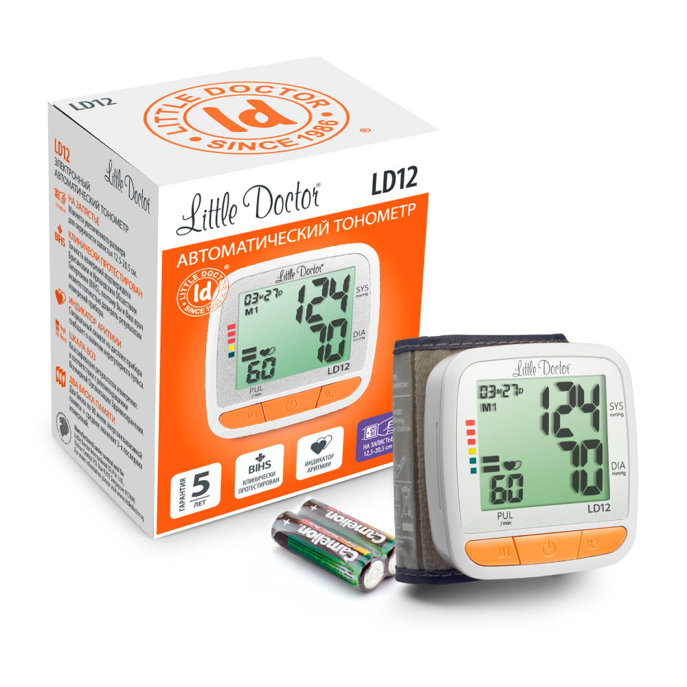 Электронный тонометр с фиксацией манжеты на запястье Little Doctor LD12 - компактный и современный высоконадежный прибор для измерения систолического и диастолического артериального давления. Прибор рекомендуется для использования пациентами с неустойчивым (непостоянным) артериальным давлением или известной артериальной гипертензией в домашних условиях, как дополнение к медицинскому наблюдению в возрасте от 15 лет.