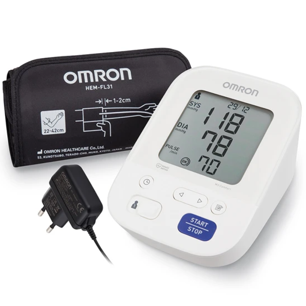Тонометр Omron M3 Comfort с инновационной манжетой Omron Intelli Wrap, для обхвата руки от 22 до 42 сантиметров. Благодаря уникальной технологии 3600 - область измерения осуществляется по всей окружности руки. Манжета обеспечивает точные результаты измерения при любом положении манжеты на плече.