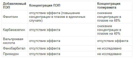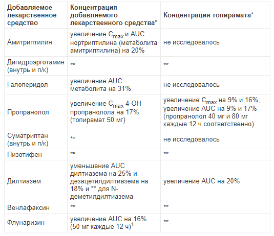 Для оценки потенциально возможных вариантов лекарственного взаимодействия между топираматом и другими лекарственными препаратами были проведены клинические исследования. Результаты данного взаимодействия суммированы в таблице.