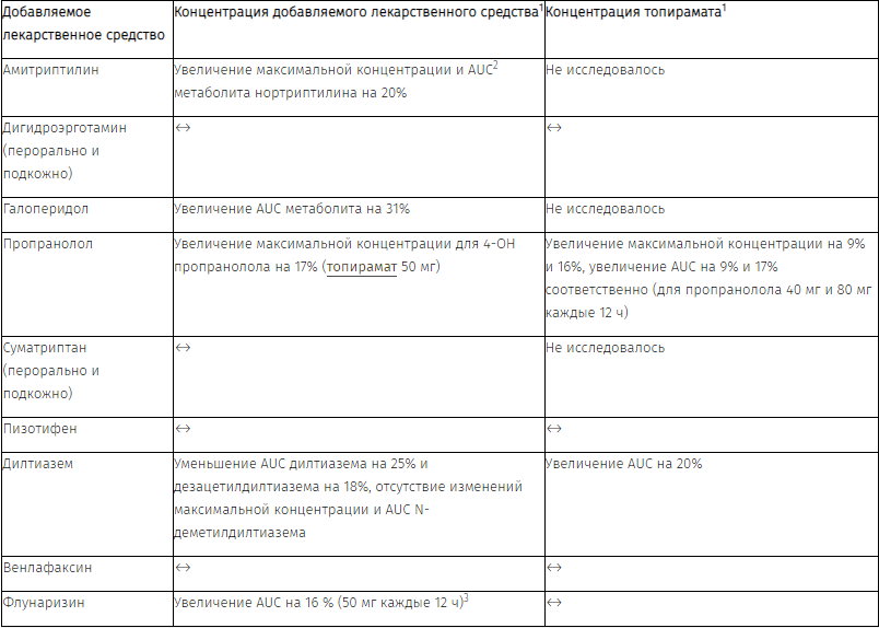 Литий: у здоровых добровольцев наблюдалось снижение AUC лития на 18% при одновременном приеме топирамата в дозе 200 мг в сутки. У больных с маниакально-депрессивным психозом применение топирамата в дозах до 200 мг в сутки не влияло на фармакокинетику лития, однако при более высоких дозах (до 600 мг в сутки) AUC лития была повышена на 26%. При одновременном применении топирамата и лития следует контролировать концентрацию последнего в плазме крови.