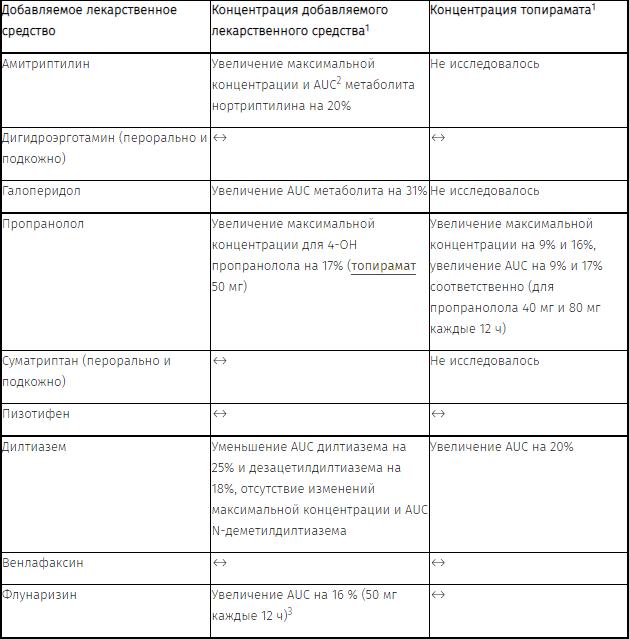 Литий: у здоровых добровольцев наблюдалось снижение AUC лития на 18% при одновременном приеме топирамата в дозе 200 мг в сутки. У больных с маниакально-депрессивным психозом применение топирамата в дозах до 200 мг в сутки не влияло на фармакокинетику лития, однако при более высоких дозах (до 600 мг в сутки) AUC лития была повышена на 26%. При одновременном применении топирамата и лития следует контролировать концентрацию последнего в плазме крови.
