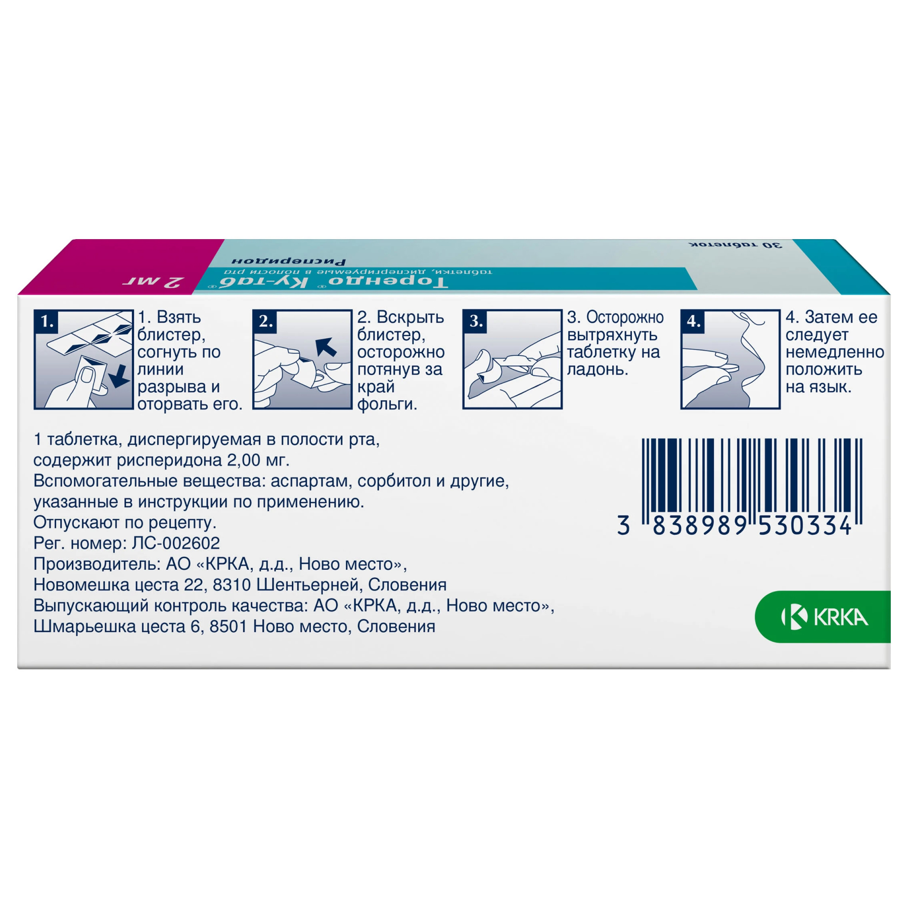 Действующее вещество: Рисперидон 2 мг.