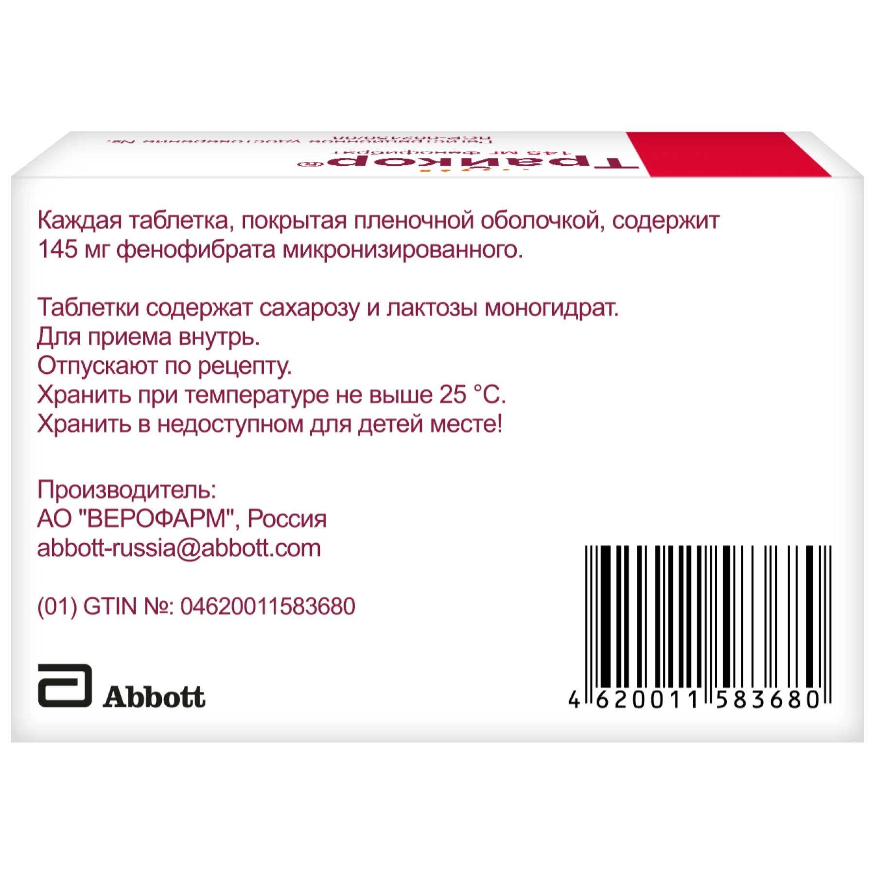 Активное вещество: фенофибрат (микронизированный) 145 мг.