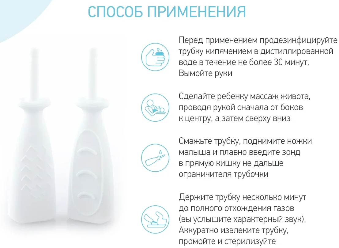 Не оставляйте ребенка одного с введенной трубочкой. Не применяйте трубочку более трех раз в день, так как чрезмерно частое использование может снизить естественные рефлексы кишечника малыша.