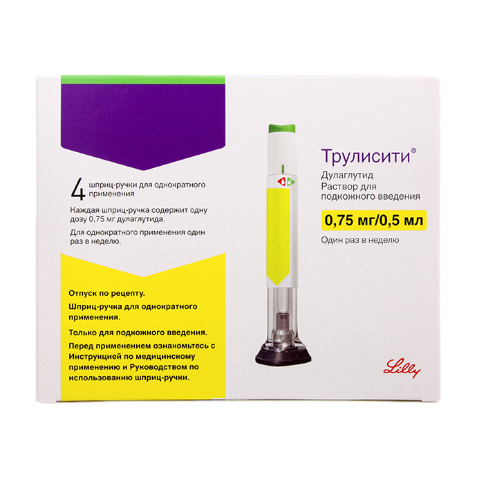- Трулисити® 0,75 мг/0,5 мл: каждая шприц-ручка содержит 0,75 мг дулаглутида в 0,5 мл раствора.