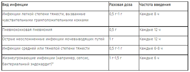 Для лечения большинства инфекций легкой и средней степени тяжести достаточной является суточная доза 25-50 мг/кг, разделенная на 3-4 введения.