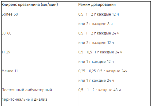 При хронической почечной недостаточности дозу назначают в зависимости от тяжести инфекции и клиренса креатинина.