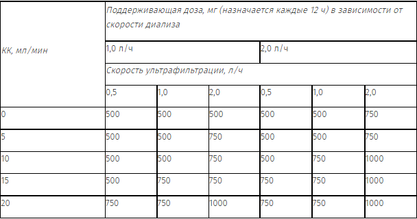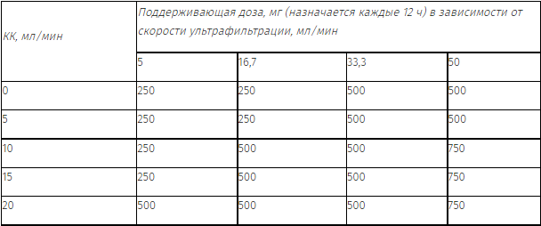 У пациентов, находящихся на гемофильтрации низкой скорости, применяют дозы, рекомендуемые при нарушении функции почек.