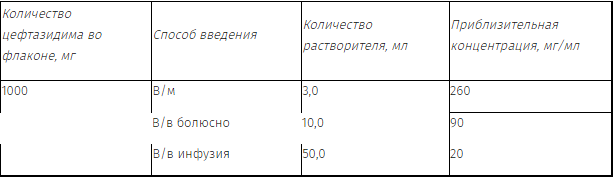 Следует использовать только свежеприготовленные растворы. После добавления растворителя флакон необходимо энергично встряхивать до полного растворения порошка. "Первичное разведение": для внутримышечного введения 1 г цефтазидима растворяют в 3 мл воды для инъекций.