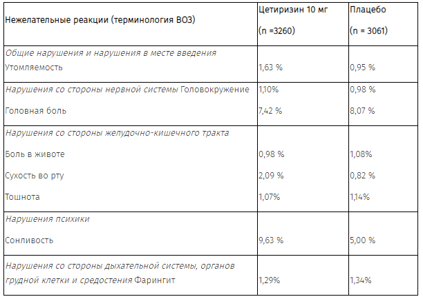 Согласно результатам объединенного анализа, в плацебо-контролируемых исследованиях при применении цетиризина в дозе 10 мг были выявлены следующие нежелательные реакции с частотой 1,0 % или выше: