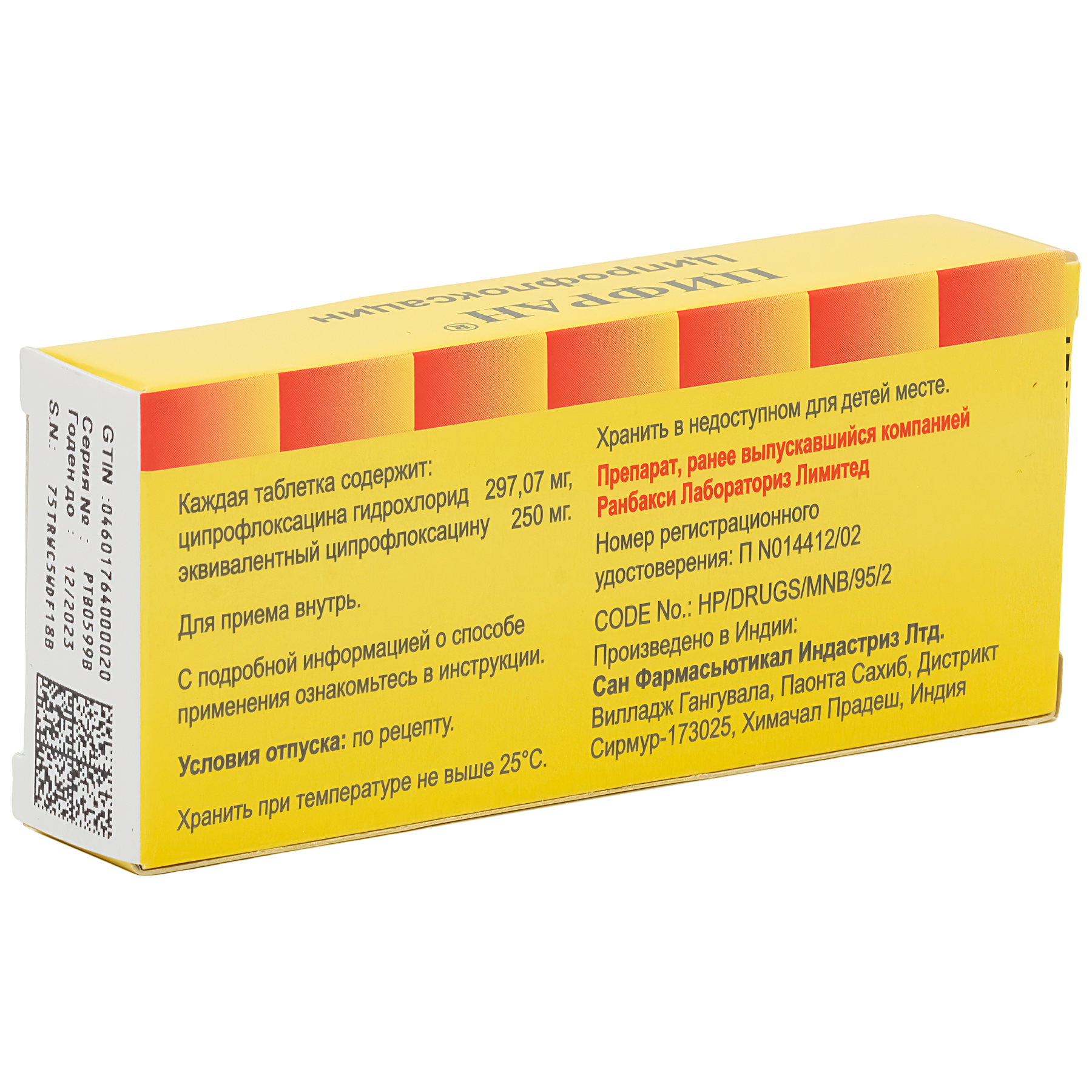 Активный ингредиент: ципрофлоксацина гидрохлорид 297,07 мг, эквивалентный ципрофлоксацину 250 мг.