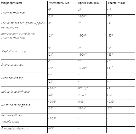 Воспроизводимые критерии исследования чувствительности к ципрофлоксацину, утвержденные Европейским комитетом по определению чувствительности к антибиотикам (EUCAST), представлены в таблице ниже: