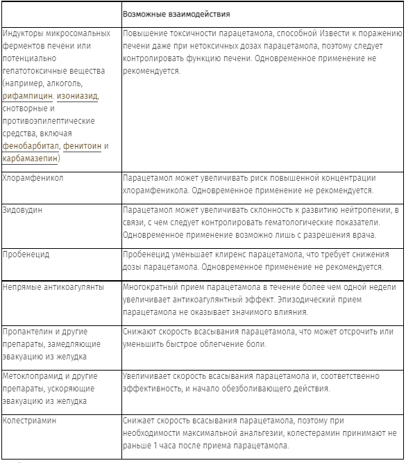 Риск отравления парацетамолом повышается у пациентов, принимающих другие потенциально гепатотоксичные лекарственные препараты или лекарственные препараты, индуцирующие микросомальные ферменты печени (например, рифампицин, изониазид, хлорамфеникол, снотворные и противосудорожные средства, включая фенобарбитал, фенитоин и карбамазепин).