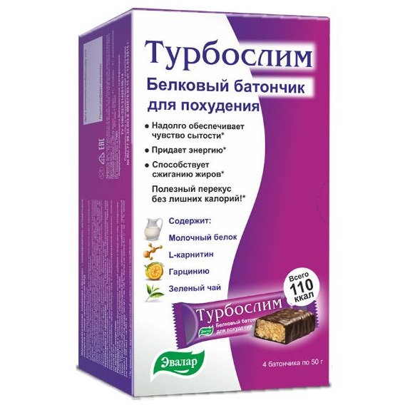 Диетический батончик для похудения Турбослим способствует ускорению обмена веществ, сжиганию жиров без потери мышечной массы, подавлению чувства голода. Эффективность батончика для похудения обусловлена активным и разносторонним действием его натуральных компонентов. Молочный белок - полноценный белок, который легко и полностью усваивается, легко расщепляется до аминокислот, которые быстро включаются в обмен веществ, ускоряя сжигание жиров без потери мышечной массы. L-карнитин ускоряет метаболические процессы в организме (обмен веществ) и способствует быстрому расщеплению жиров. Пищевые волокна («Экасия» - комбинация натуральных пищевых волокон) разбухают в желудке, приносят ощущение сытости, регулируют углеводный и жировой обмен, положительно влияют на кишечную флору, ускоряют очищение организма от токсинов и продуктов метаболизма, что особенно важно при похудении. Экстракт гарцинии способствует подавлению аппетита. Блокирует синтез жиров, препятствует образованию избыточного холестерина, снижает ожирение печени, улучшает обмен веществ и повышает энергетический баланс организма. Экстракт зеленого чая ускоряет метаболизм и повышает работоспособность, снижает чувство голода, устраняет усталость. Хром снижает аппетит, подавляет влечение к сладкому, нормализует уровень сахара в крови.