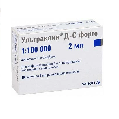Ультракаин® Д-С форте в области переходной складки путем его введения в подслизистую с вестибулярной стороны (по 1,7 мл препарата на зуб). В редких случаях для достижения полной анестезии может потребоваться дополнительное введение от 1 мл до 1,7 мл. В большинстве случаев это позволяет не проводить болезненной нёбной инъекции. При удалении нескольких рядом расположенных зубов количество инъекций обычно удается ограничить.