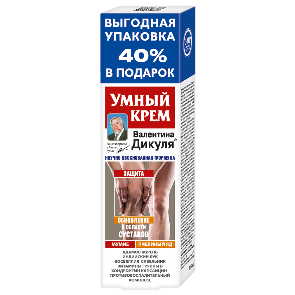 Крем для тела "Валентина Дикуля .Мумие. Пчелиный яд" серии "Умный крем" - натуральное средство нового поколения, оказывающее избирательное направленное действие с учетом индивидуального характера функциональных нарушений. "Умная" формула крема позволяет выявить главный источник проблемы и решать ее комплексно, воздействуя непосредственно на ее причины. Действие крема для тела определяется высокоэффективным натуральным составом и "умной" формулой крема, позволяющей выявить главный источник проблемы и решать ее поэтапно и комплексно, воздействуя не на внешние проявления, а на ее причины. Свойства компонентов: Мумиё (Asphaltum) - от греч. "сохраняющее тело". Уникальный природный биостимулятор, сложное по химической структуре природное образование, добываемое в горах. Более трёх тысяч лет широко используется медицине. Стимулирует восстановительные процессы в суставах и пролиферацию клеток соединительных тканей, обладает противоотёчным, противовоспалительным, антитоксическим, иммуностимулирующим, общеукрепляющим действием.