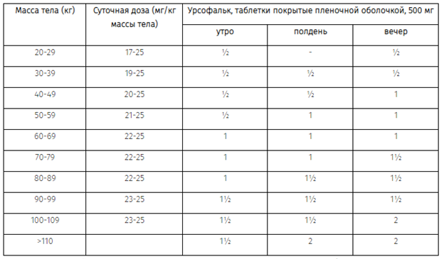 Рекомендуемая доза составляет 10 мг урсодезоксихолевой кислоты на 1 кг массы тела в сутки, что соответствует:
